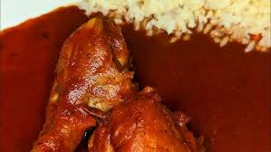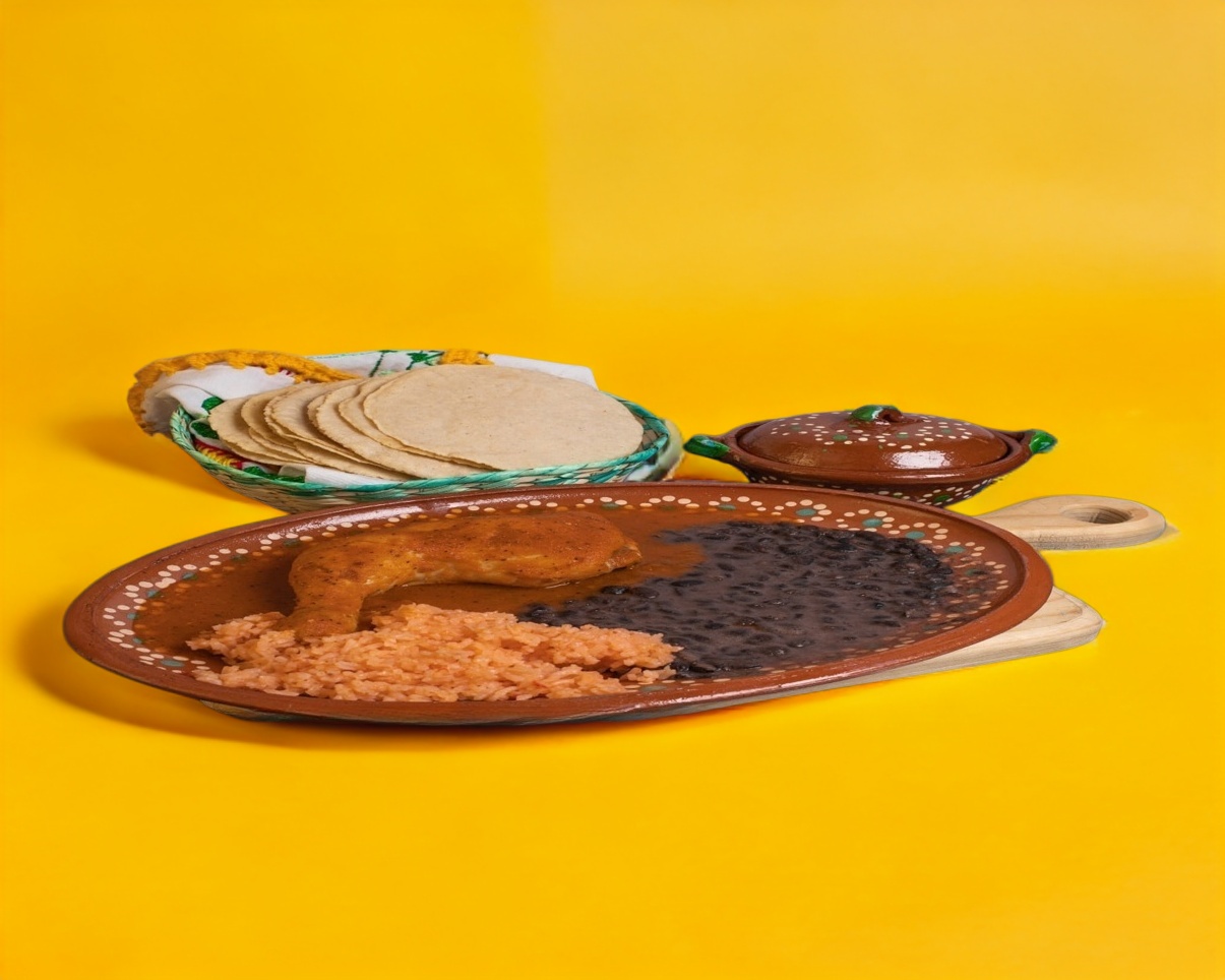 Pierna de pollo en chile colorado, acompañada de arroz, frijoles y tortillas.