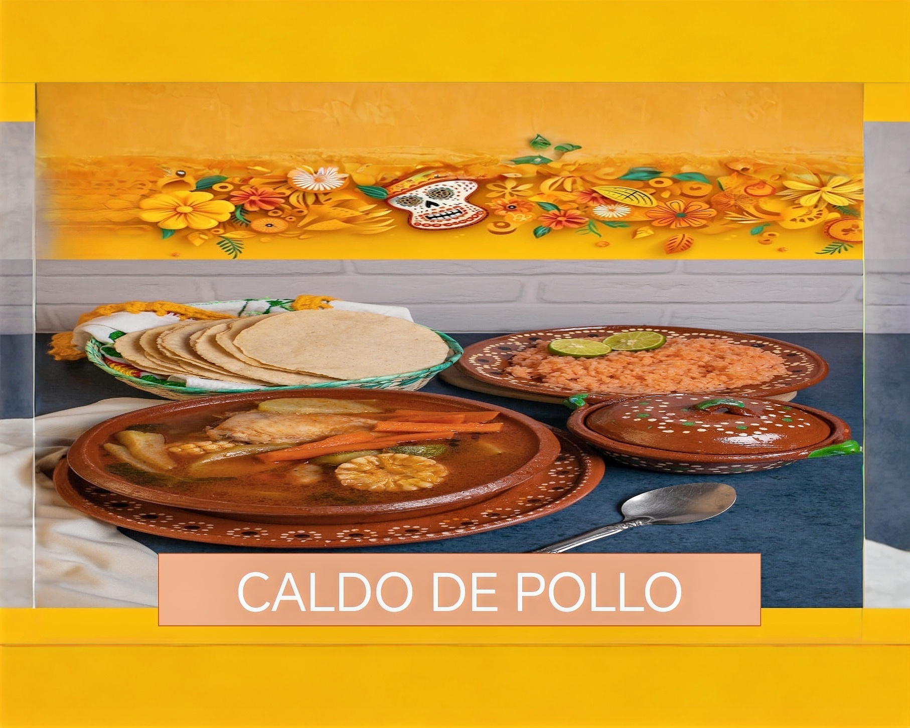 Caldo con verduras y una pierna de pollo, acompañado de arroz y tortillas.