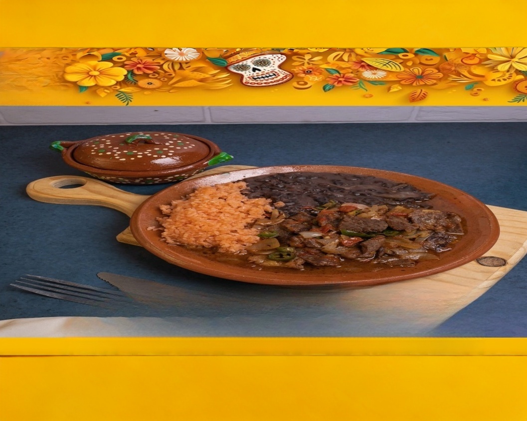 Bistec guisado a la mexicana, acompañado de arroz, frijoles y tortillas.
