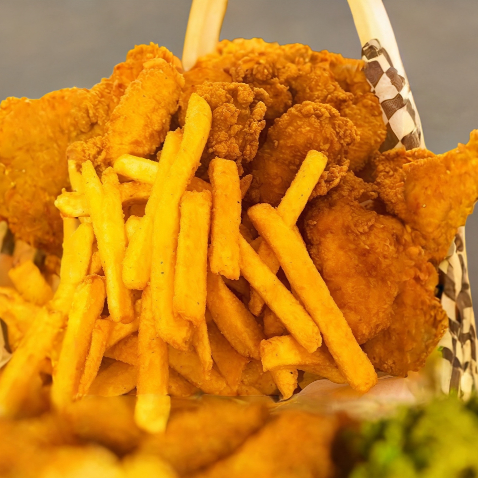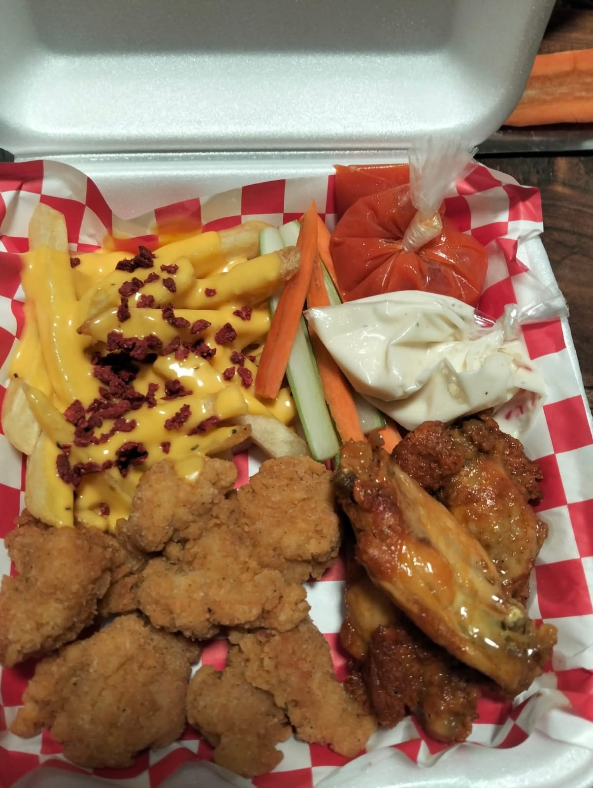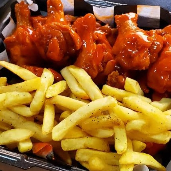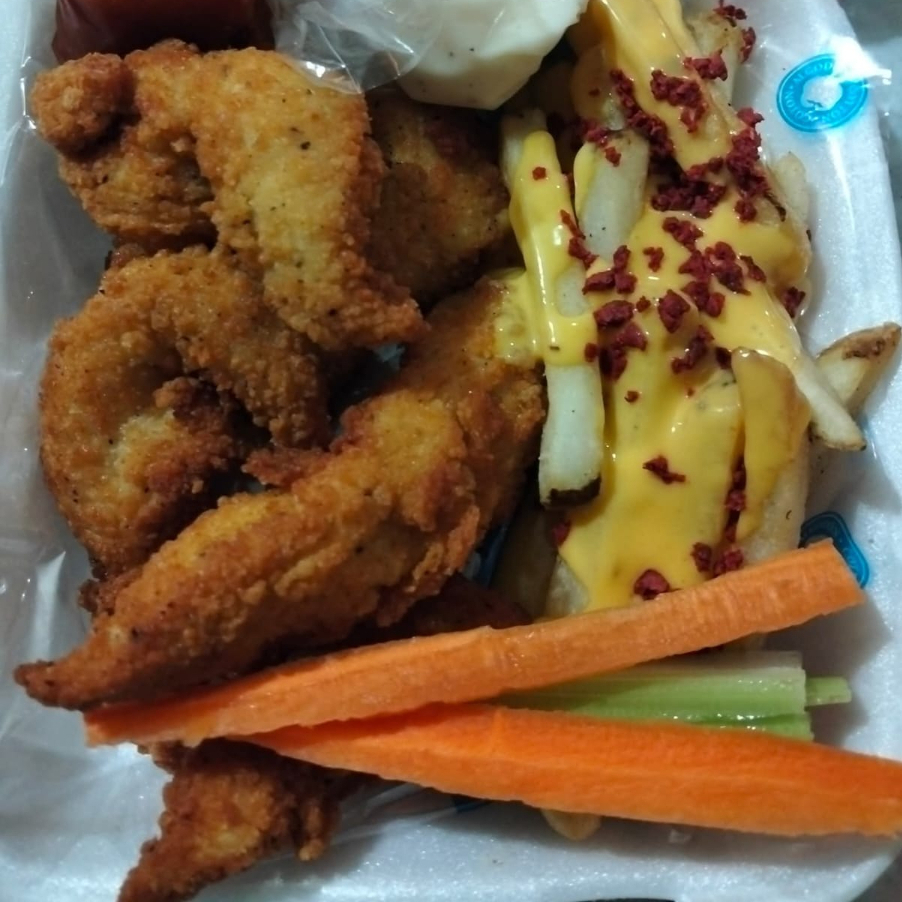 Papas fritas,verdura. Salsa a escoger:bbq,bufalo,habanero,lemon pepper y ranch.