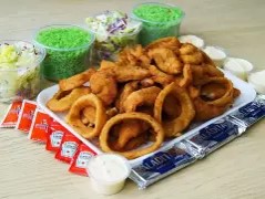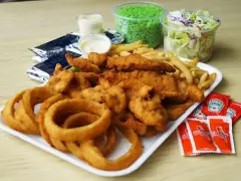 Charola de 1/2 kg de camarón y filete empanizados con sus complementos