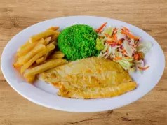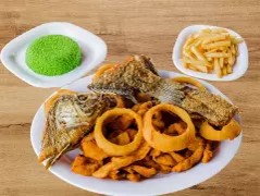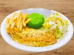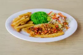 Filete de pescado, arroz al cilantro, papas a la francesa y ensalada