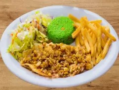 camarones, arroz al cilantro, papas a la francesa y ensalada verde