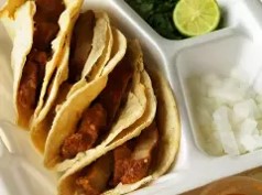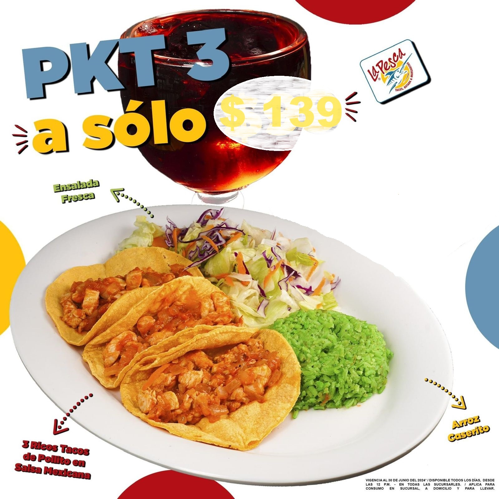 Disfruta de nuestro paquete de 3 taquitos de pollito en salsa mexicana, con su bebida y su postre a un precio especial