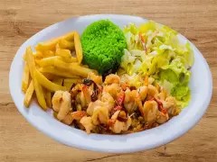 Camarón, pulpo y surimi, arroz al cilantro, papas a la francesa y ensalada