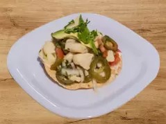 Lechuga, tomate, cebolla, chile, cilantro, aguacate, tortilla, pepino, filete de pescado y aderezo