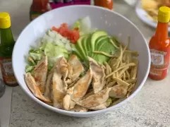 Lechuga, tomate, cebolla, chile, cilantro, aguacate, tortilla, pepino, pechuga de pollo y aderezo