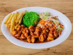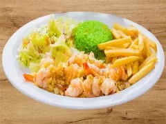 Camarones, arroz al cilantro, papas a la francesa y ensalada