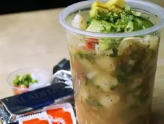 Disfruta de unos camarones empanizados y una tostada de ceviche acompañados de todos sus complementos