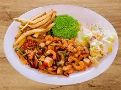 Filete de pescado, camarón, pulpo y surimi, arroz al cilantro, papas a la francesa y ensalada