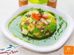 Arroz al cilantro, camarón coctelero, surimi, pulpo, cebolla, tomate , chile y salsa cilantro