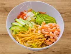 Lechuga, tomate, cebolla, chile, cilantro, aguacate, tortilla, pepino, camarón coctelero y aderezo