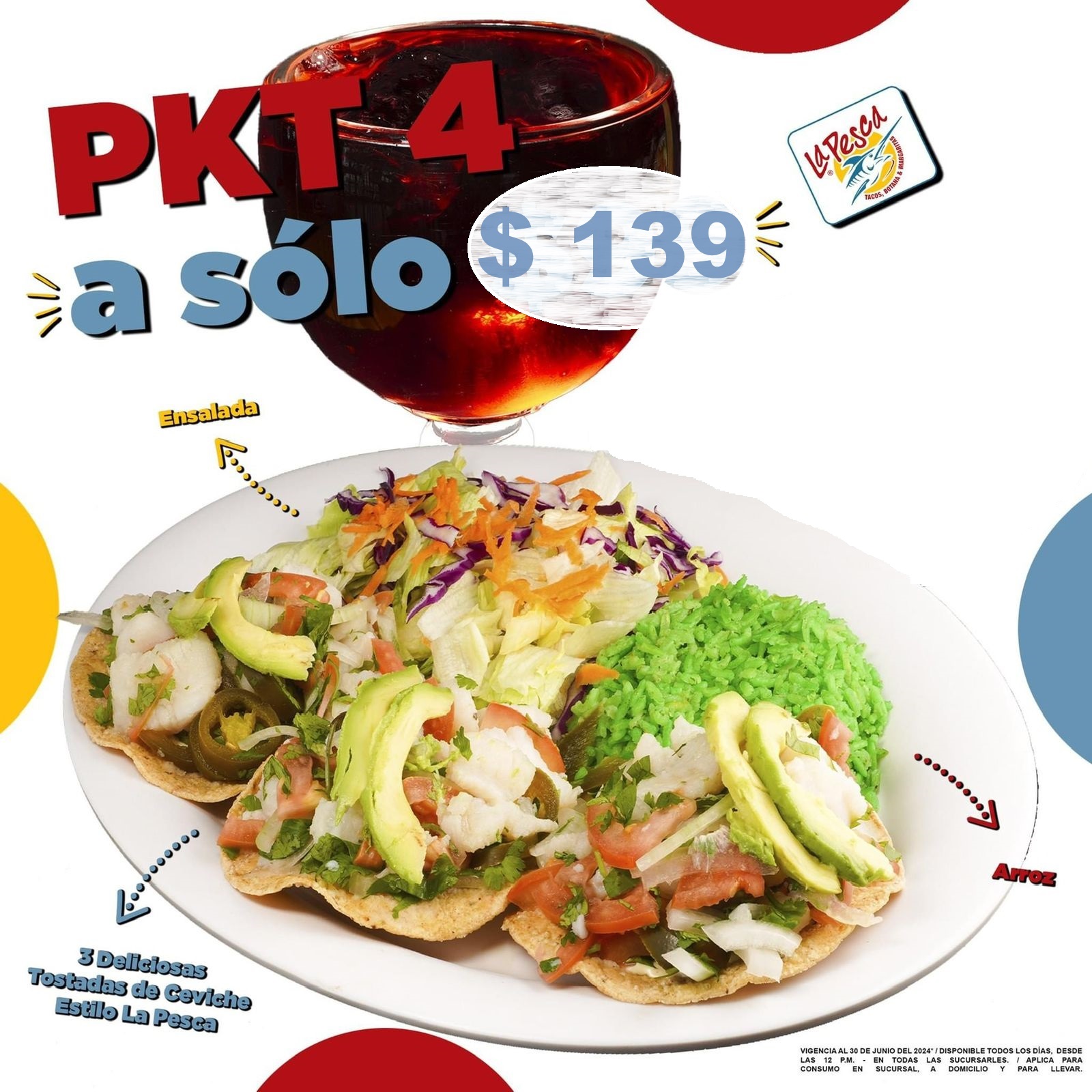 Disfruta de nuestro paquete de 3 tostadas de ceviche estilo la pesca, con su bebida y su postre a un precio especial