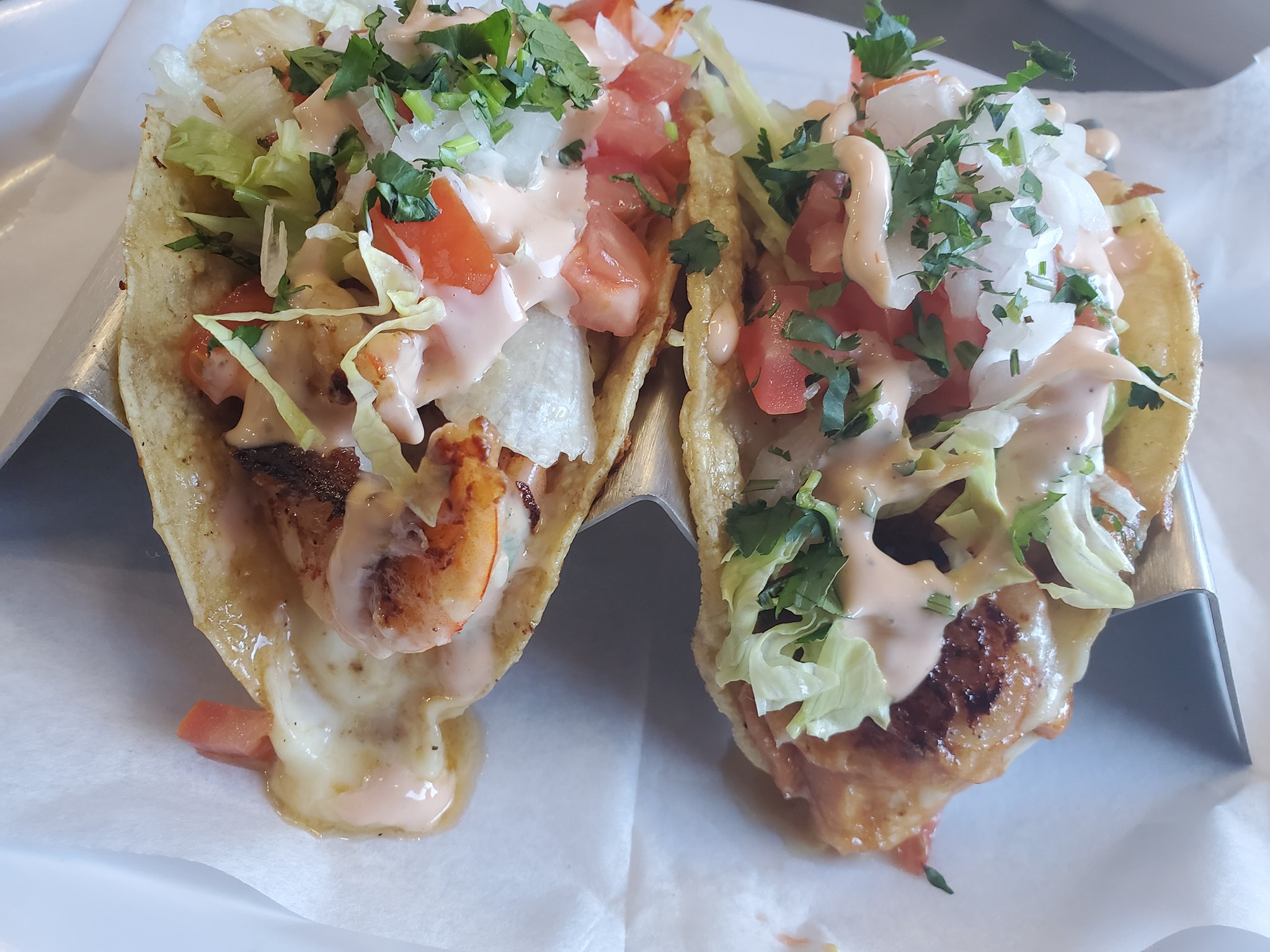 Disfruta de unos camarones empanizados y dos tacos de filete acompañados de todos sus complementos