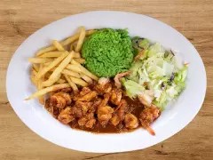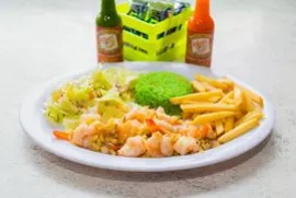 Camarones, arroz al cilantro, papas a la francesa y ensalada verde