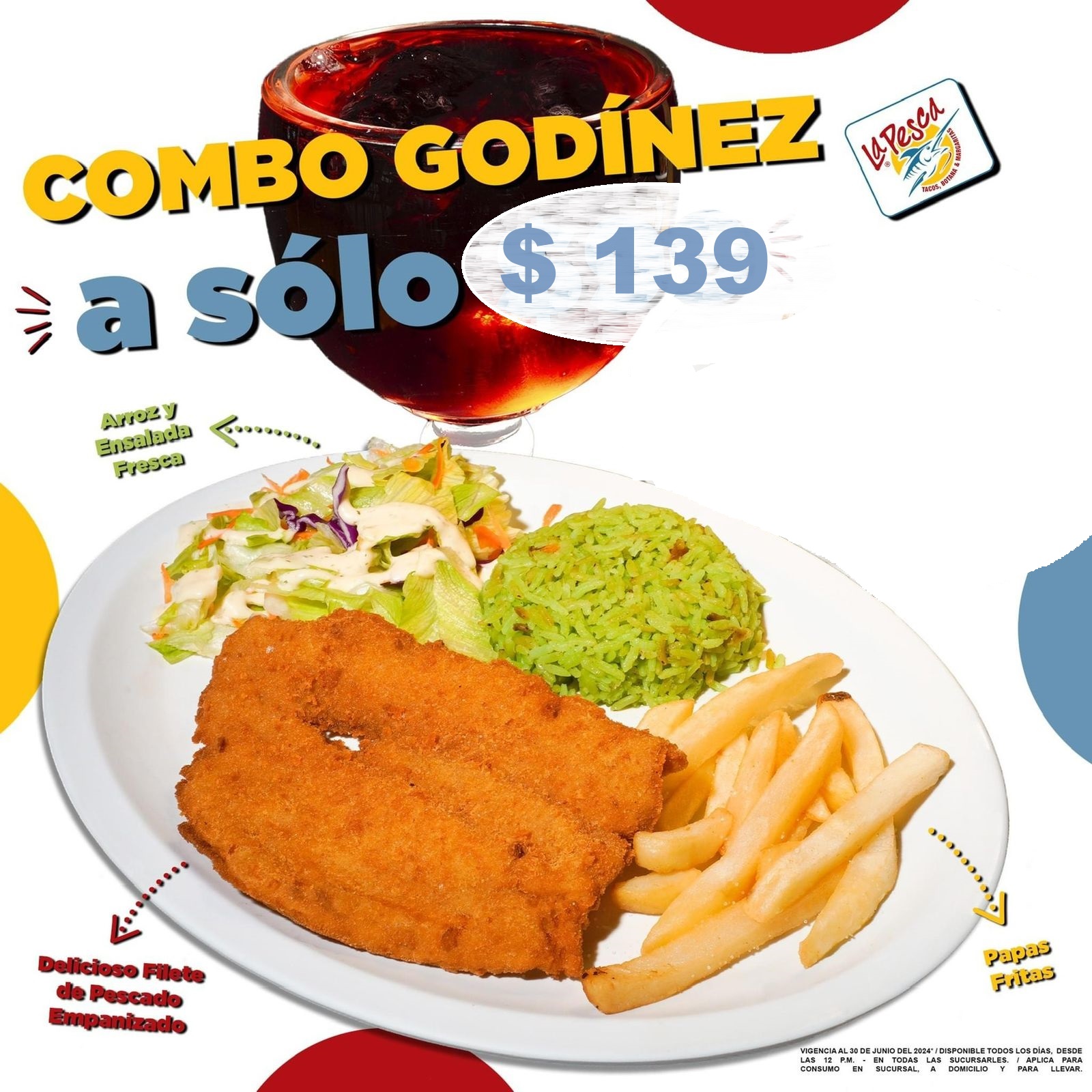 Disfruta de nuestro paquete godínez con un filete de pescado, con su bebida y su postre a un precio especial