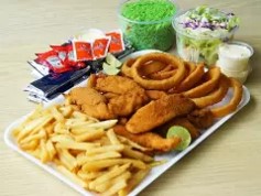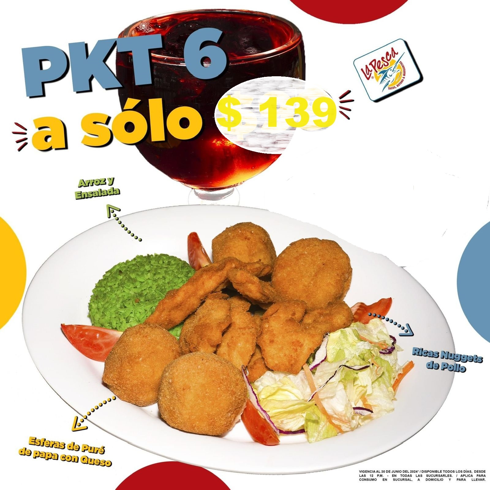 Disfruta de nuestro paquete de esferas de pure de papa con queso y nuggets de pescado, con su bebida y su postre a un precio especial