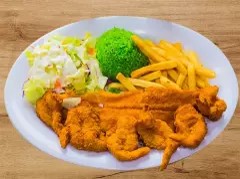 Filete de pescado, camarones, arroz al cilantro, papas a la francesa y ensalada