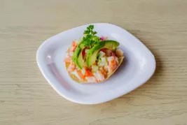 Lechuga, tomate, cebolla, chile, cilantro, aguacate, tortilla, pepino, camarón coctelero, surimi, pulpo y aderezo