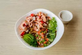 Camarón coctelero, pulpo cocido, surimi, tajin, chile cambray, aguacate, cilantro, cebolla y tomate