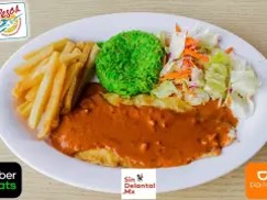 A la plancha, o con salsa al cambray, con papas a la francesa, arroz al cilantro y ensalada