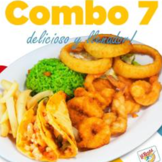 Filete de pescado, camarón, pulpo y surimi, arroz al cilantro, papas a la francesa y ensalada