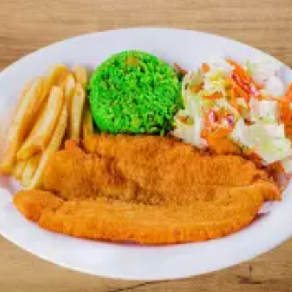 Filete de pescado, arroz al cilantro, papas a la francesa y ensalada