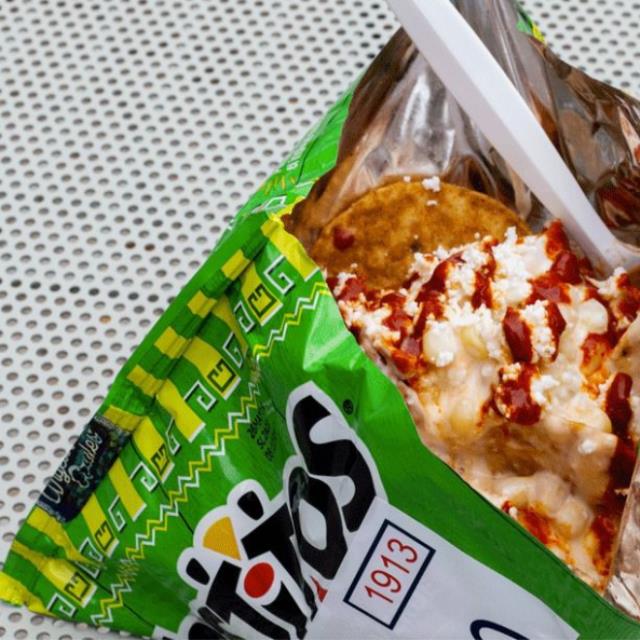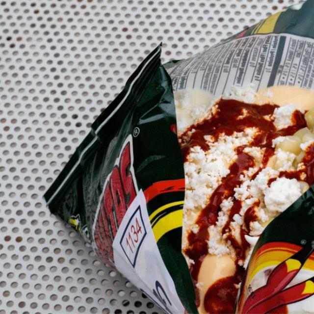 Tostitos Flaming Hot con elote y aderezos al gusto (mayonesa, crema, queso amarillo, chile líquido, queso panela).