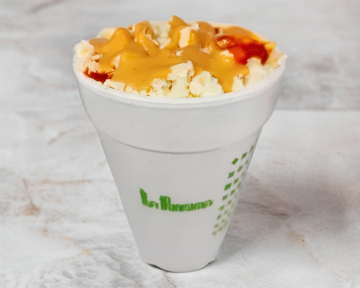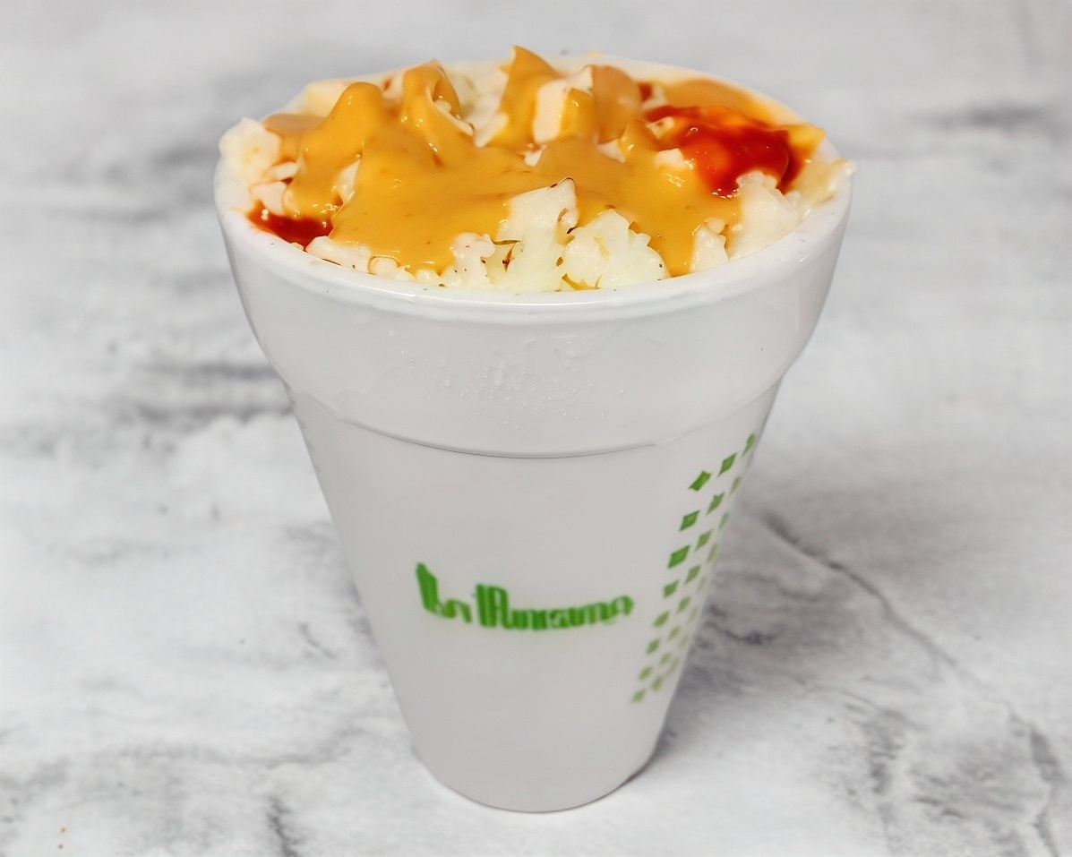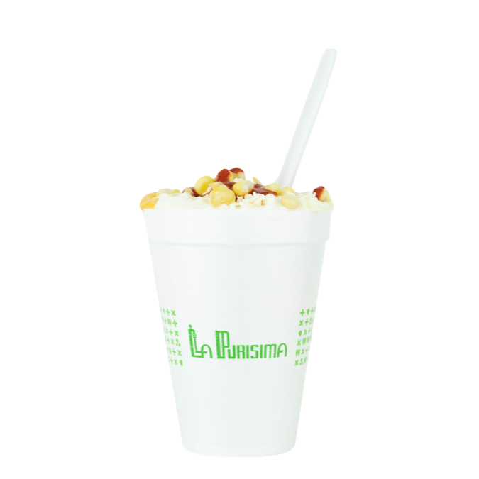 Grano de elote blanco, con mayonesa, crema, chile líquido, queso amarillo, queso panela, todos los aderezos aparte.