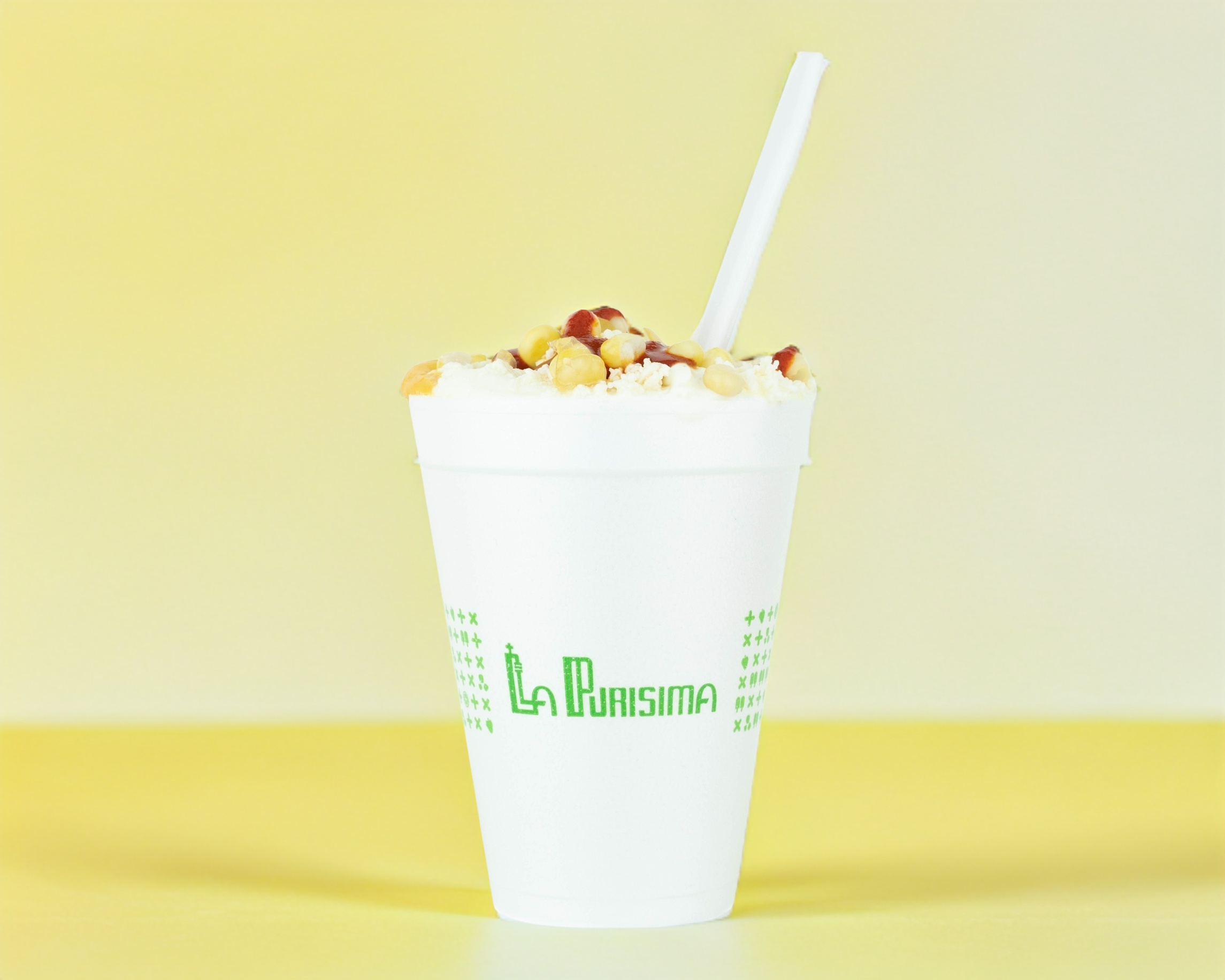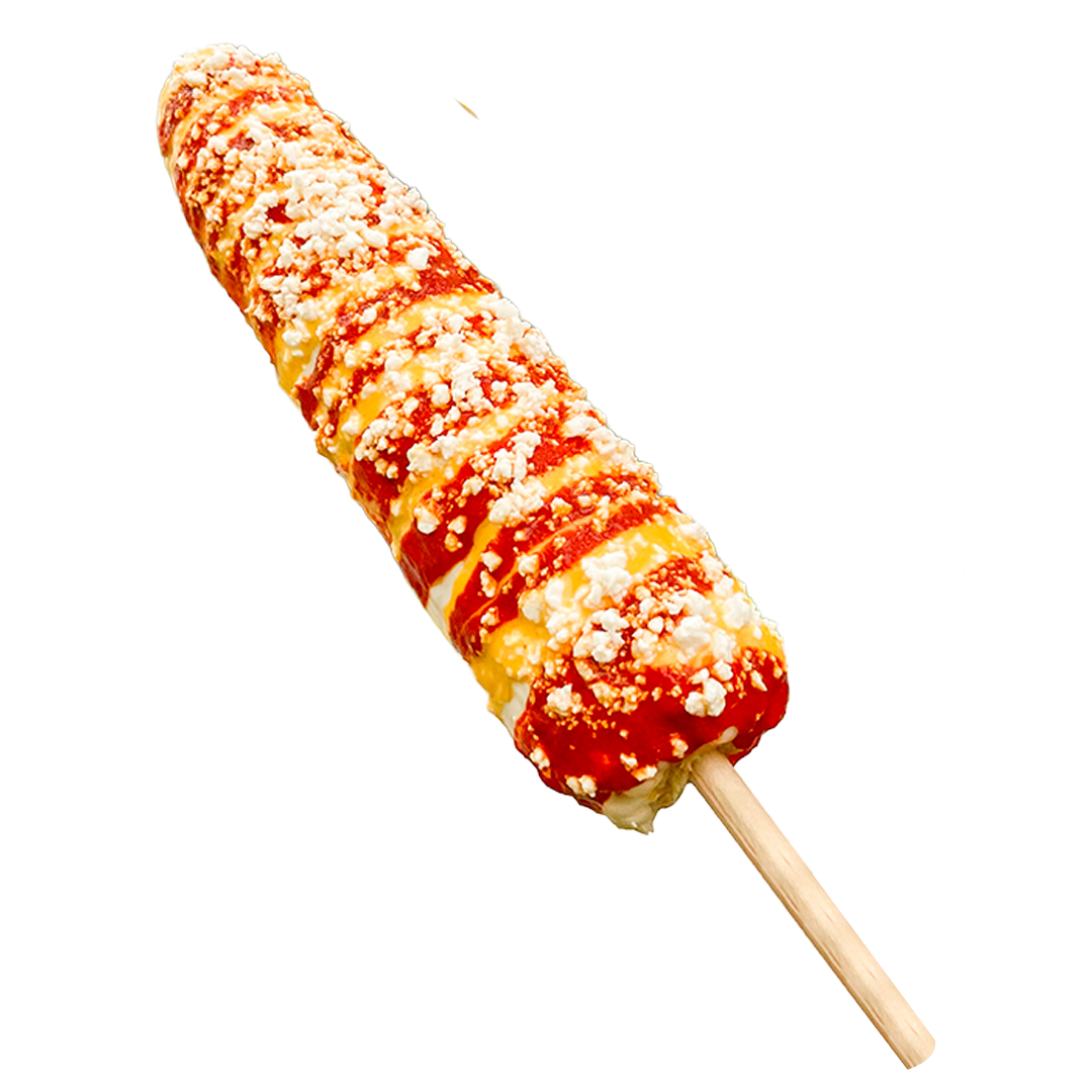 Grano de elote blanco, con mayonesa, crema, chile liquido, queso amarillo, queso panela, todos los aderezos aparte.