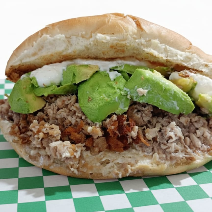 Torta de pierna al horno(calientita)Delicioso pan suave y gigante, Exquisita carne de pierna al horno, 1 Aguacate completo, Crema, Mayonesa.