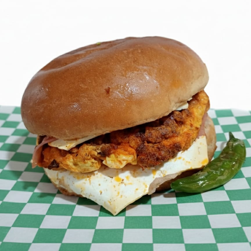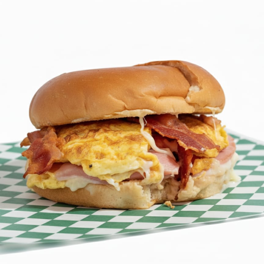 Delicioso pan suave y gigante, tres huevos en omelete, tocino, 2 Rebanadas de jamón, queso manchego y frijoles refritos.