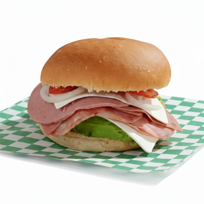 Delicioso pan suave y gigante, 1 Aguacate completo, 2 Rebanadas de jamón, 2 Rebanadas de queso de puerco, 2 Rebanadas de pastel pimiento, 2 Rebanadas de queso panela.