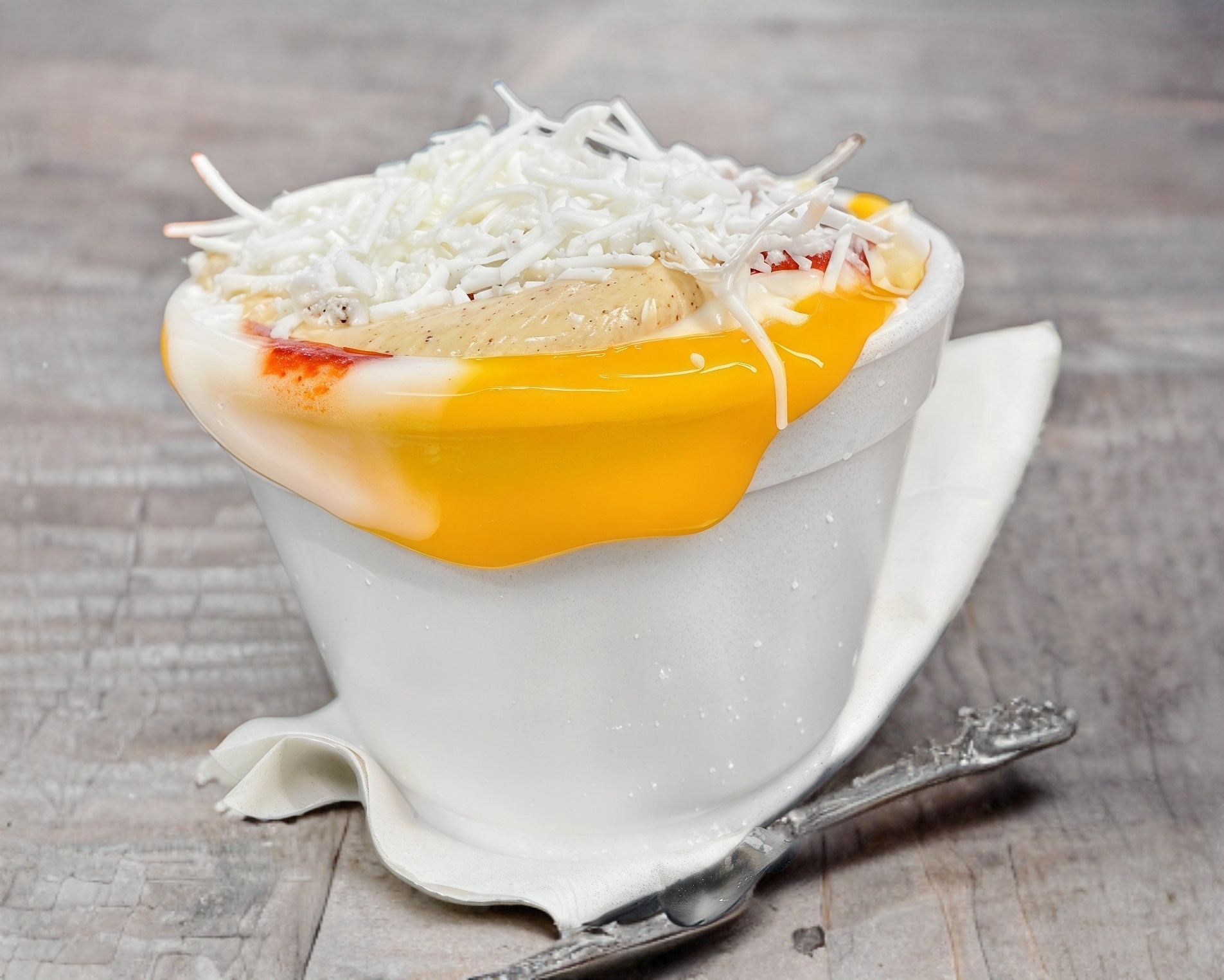 Vasito de elote desgranado con mayonesa, crema, queso amarillo, chile, chipotle, habanero y queso rallado