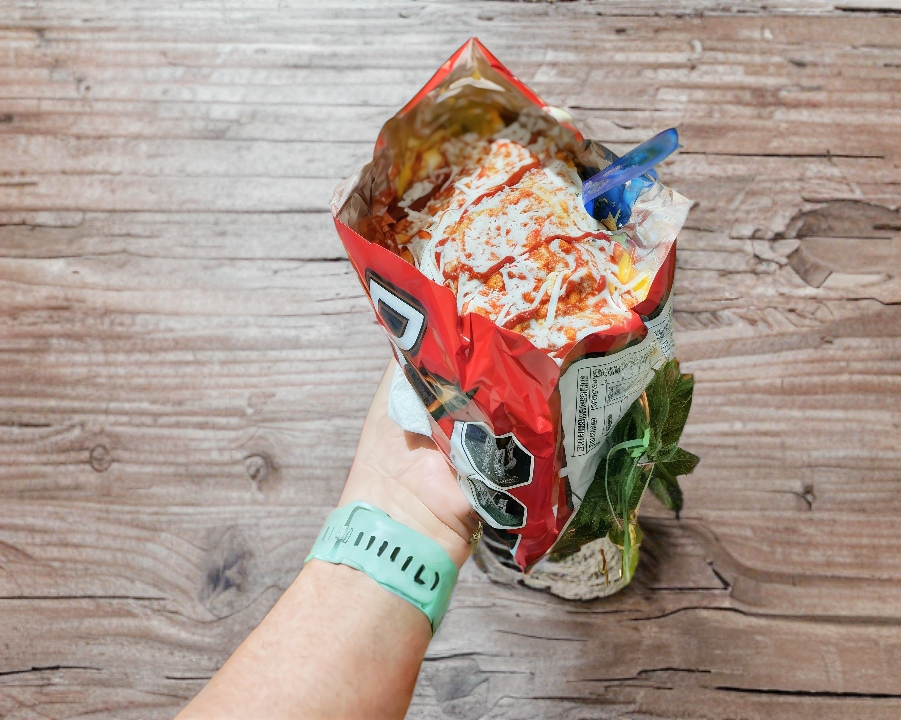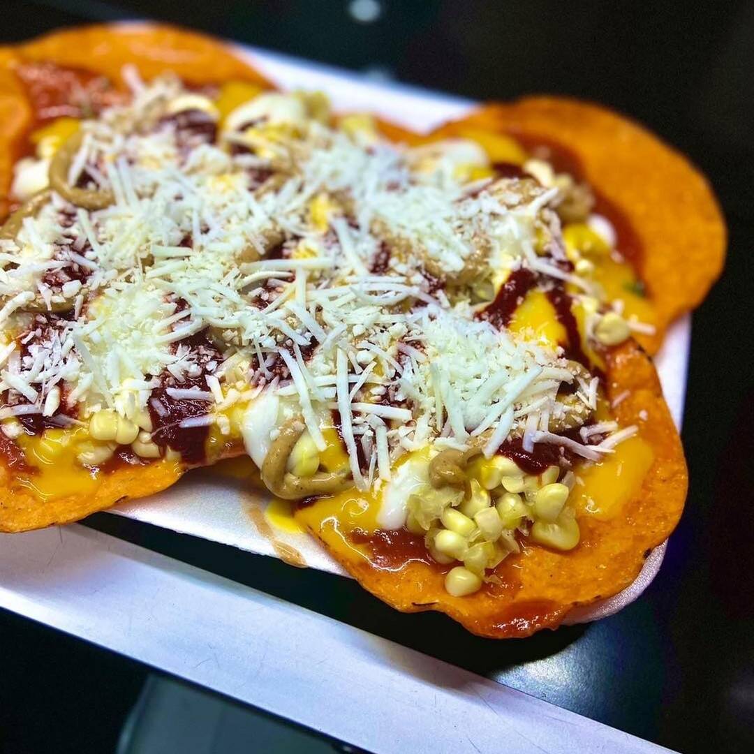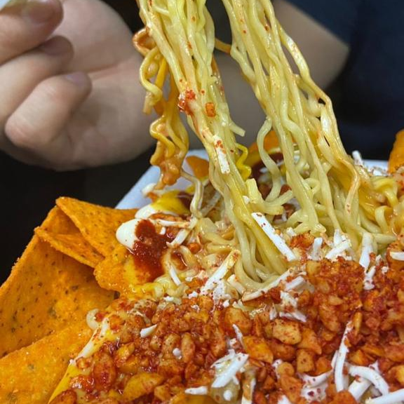 Maruchan en una cama de elote, con fritos y aderezos a tu elección.