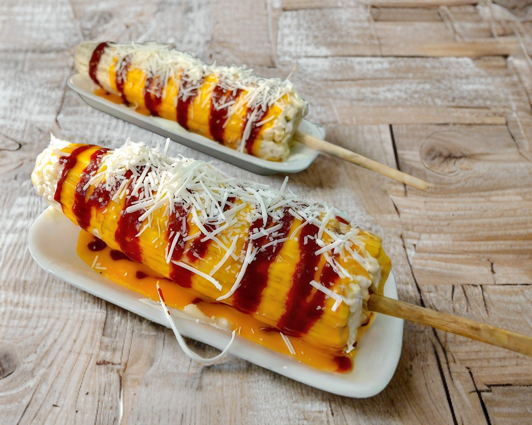Elote entero con mayonesa, crema, queso amarillo, chile, chipotle, habanero y queso rallado.