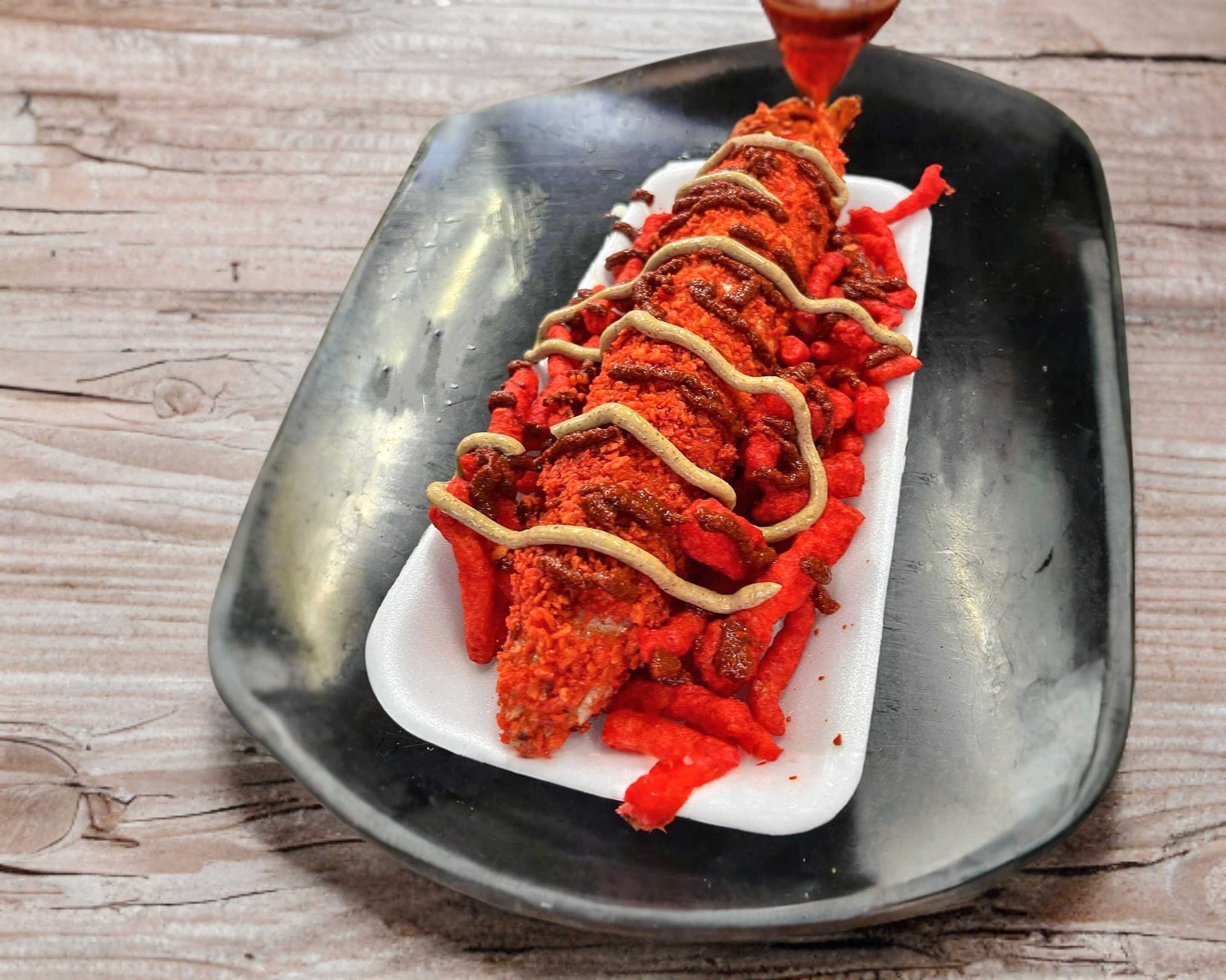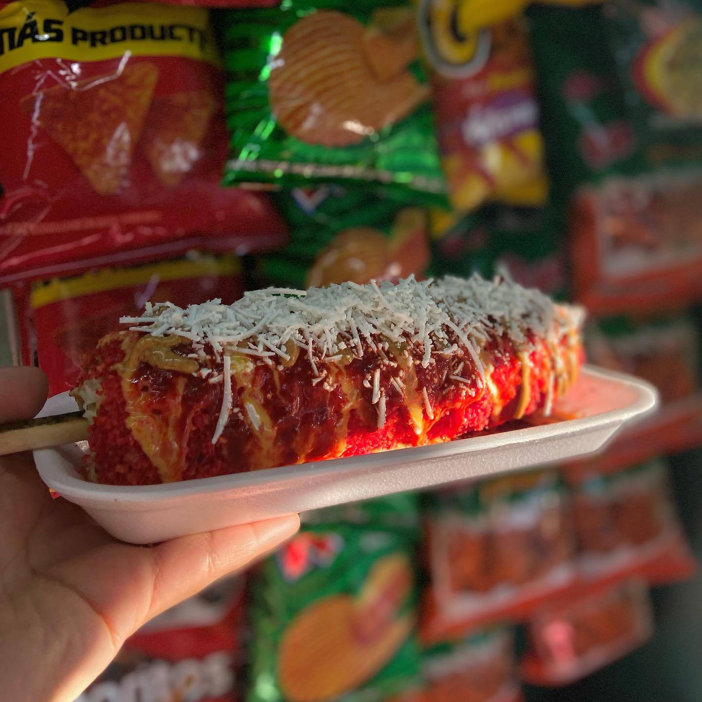 Elote entero empanizado con una bolsa de fritos a escoger y aderezos.