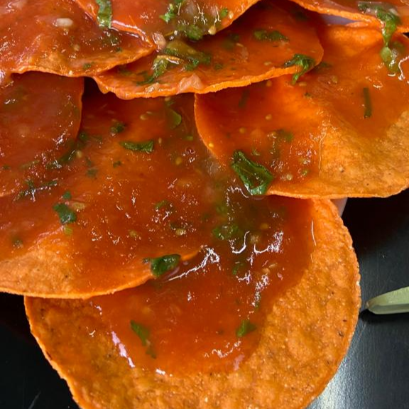 Plato con 5 tostadas bañadas con su tradicional salsa.