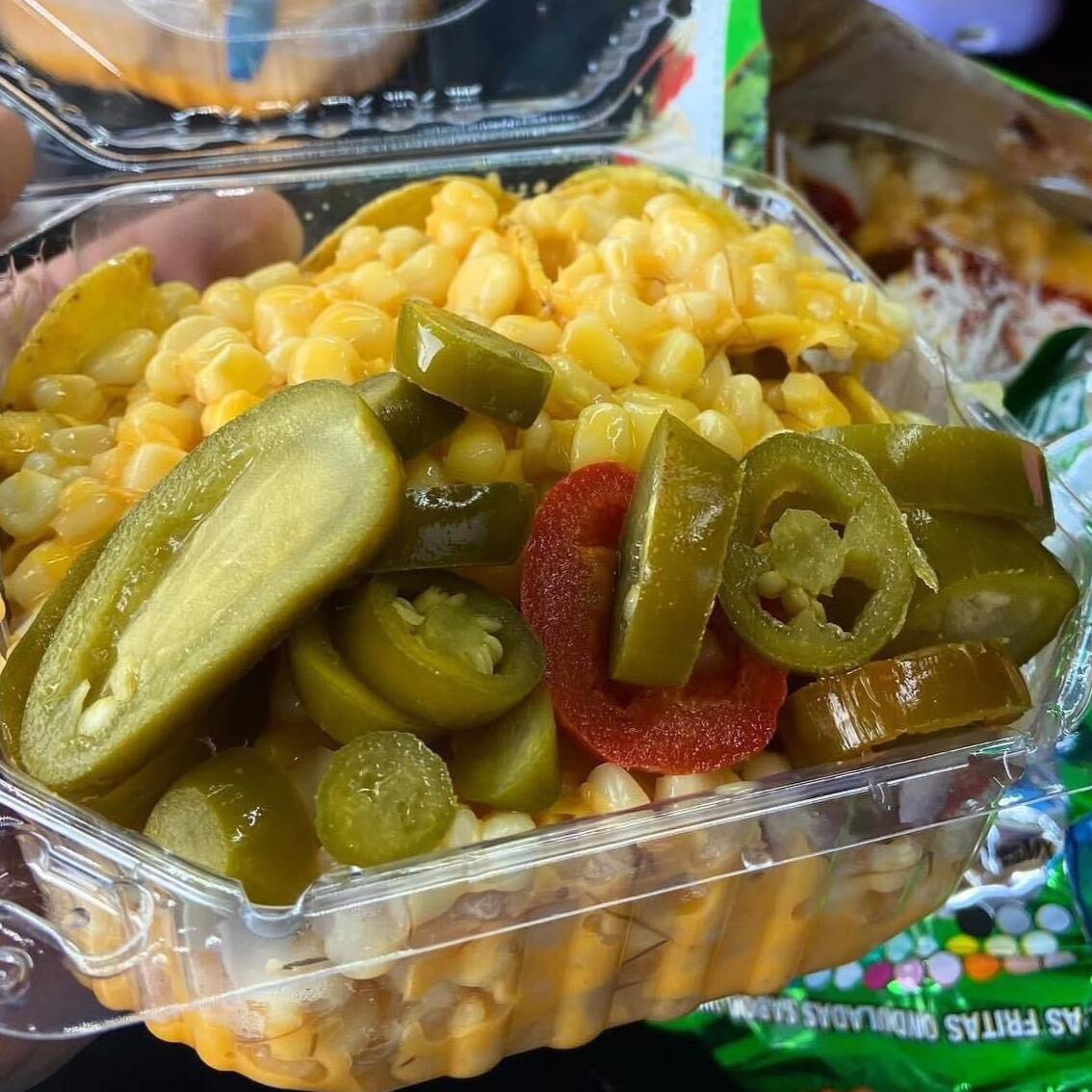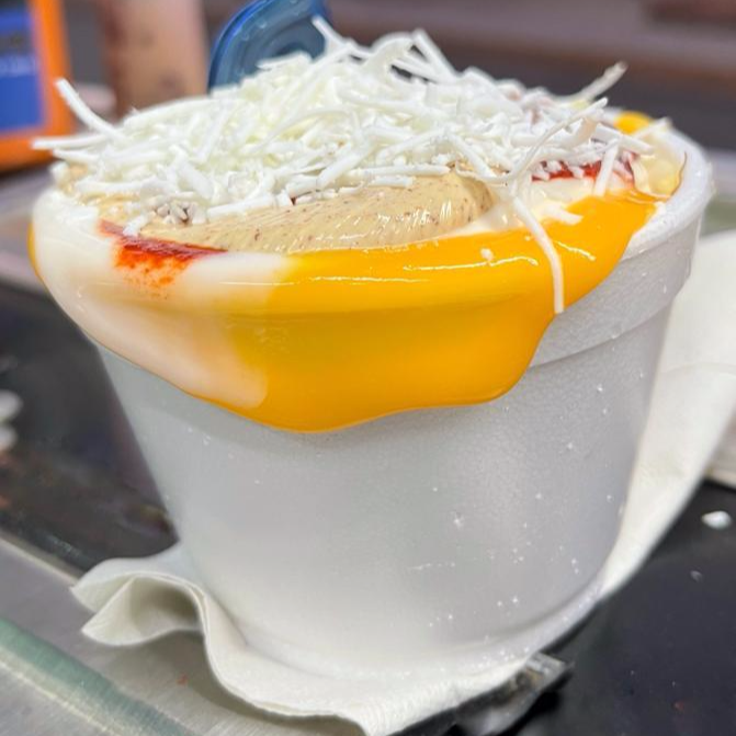 Vasito de elote desgranado con mayonesa, crema, queso amarillo, chile, chipotle, habanero y queso rallado.
