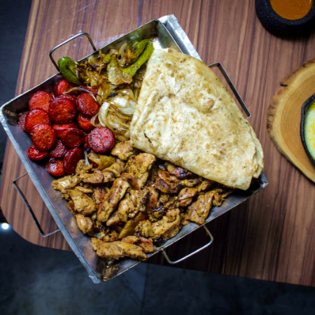½ Kg de fajita de pollo sazonado con el sabor de la casa, acompañado de : ¼ salchicha mexicana, cebolla asada con pimiento, morrón, ¹ tortilla de harina gigante, 2 frijoles charros, salsa verde, roja y pico de gallo.
