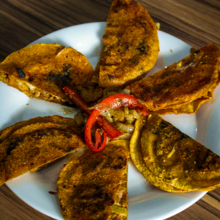 Tortilla sobre tortilla y en el interior guiso a elegir (chicharrón, frijoles, tripa, camarón y molleja).