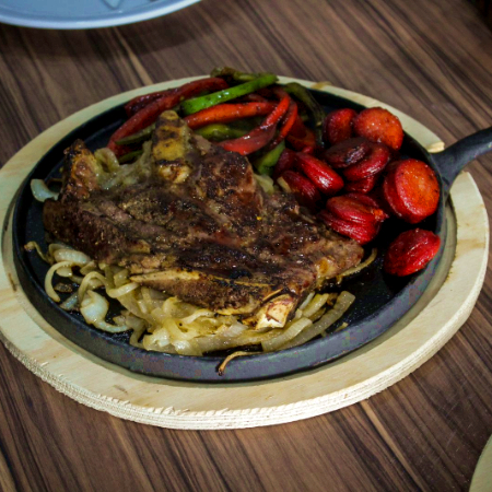 Asado a la parrilla, acompañado de cebolla, pimiento morron presentado en plato caliente de acero.