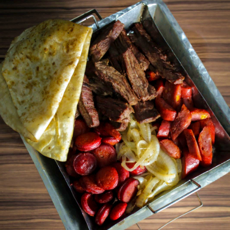Asado a la parrilla, acompañado de cebolla, pimiento morron presentado en plato caliente de acero y salchicha mex.