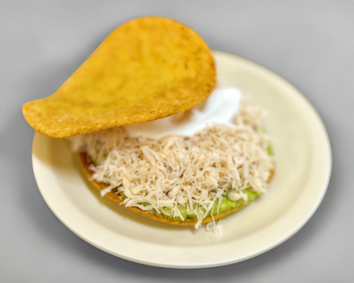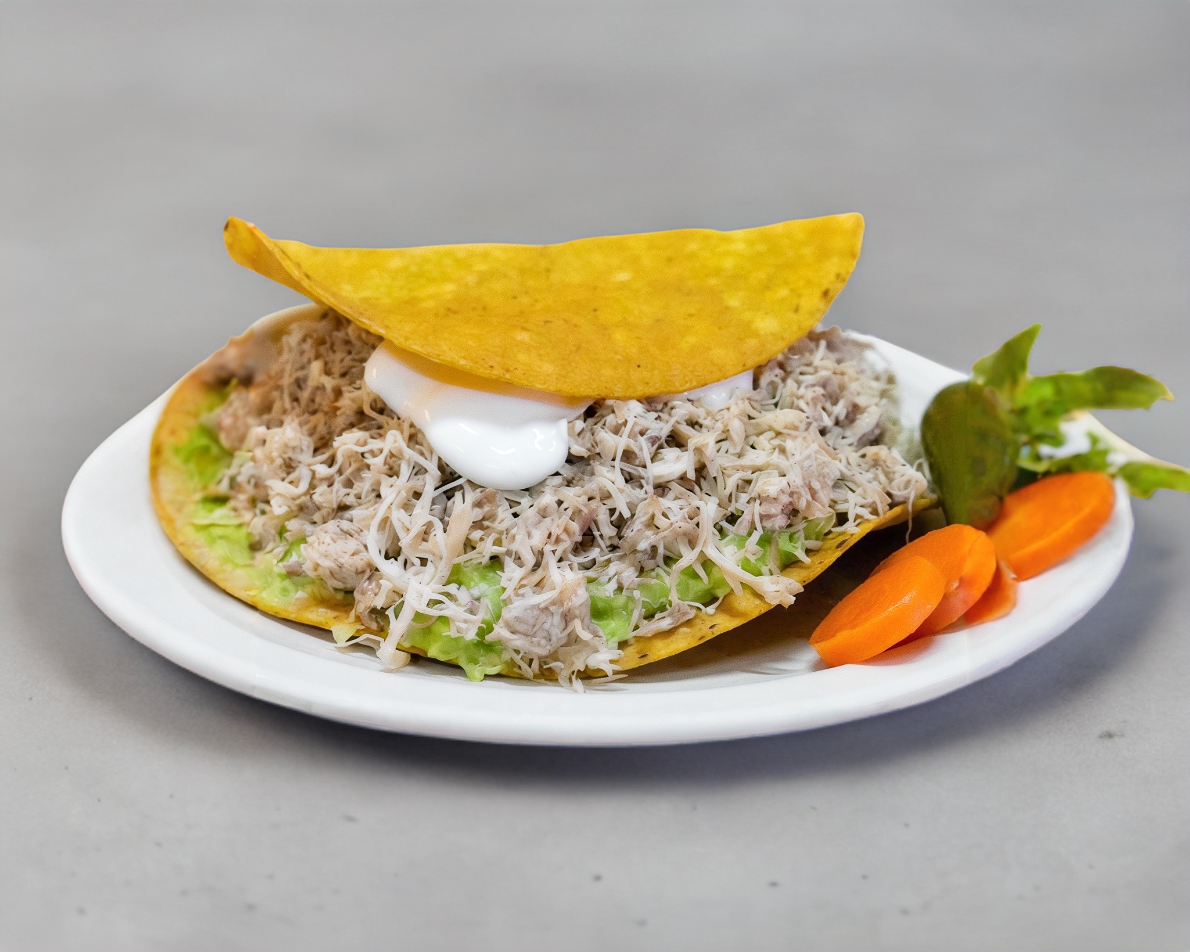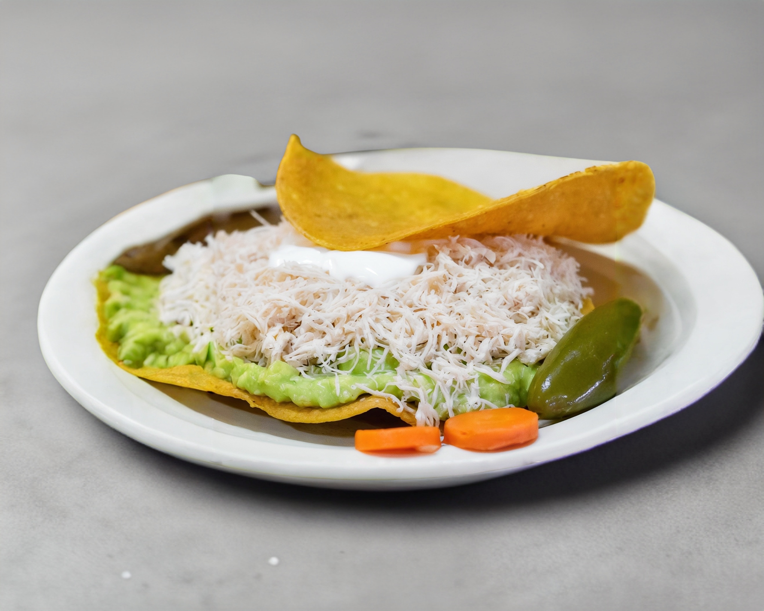 Tostada ESPECIAL (1 pieza)tipo siberia de pechuga de pollo desmenuzada, con guacamole y crema, (chile en vinagre por aparte) (Porcion personal)
