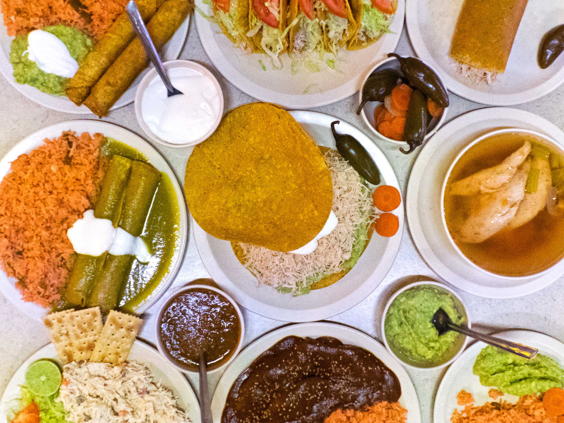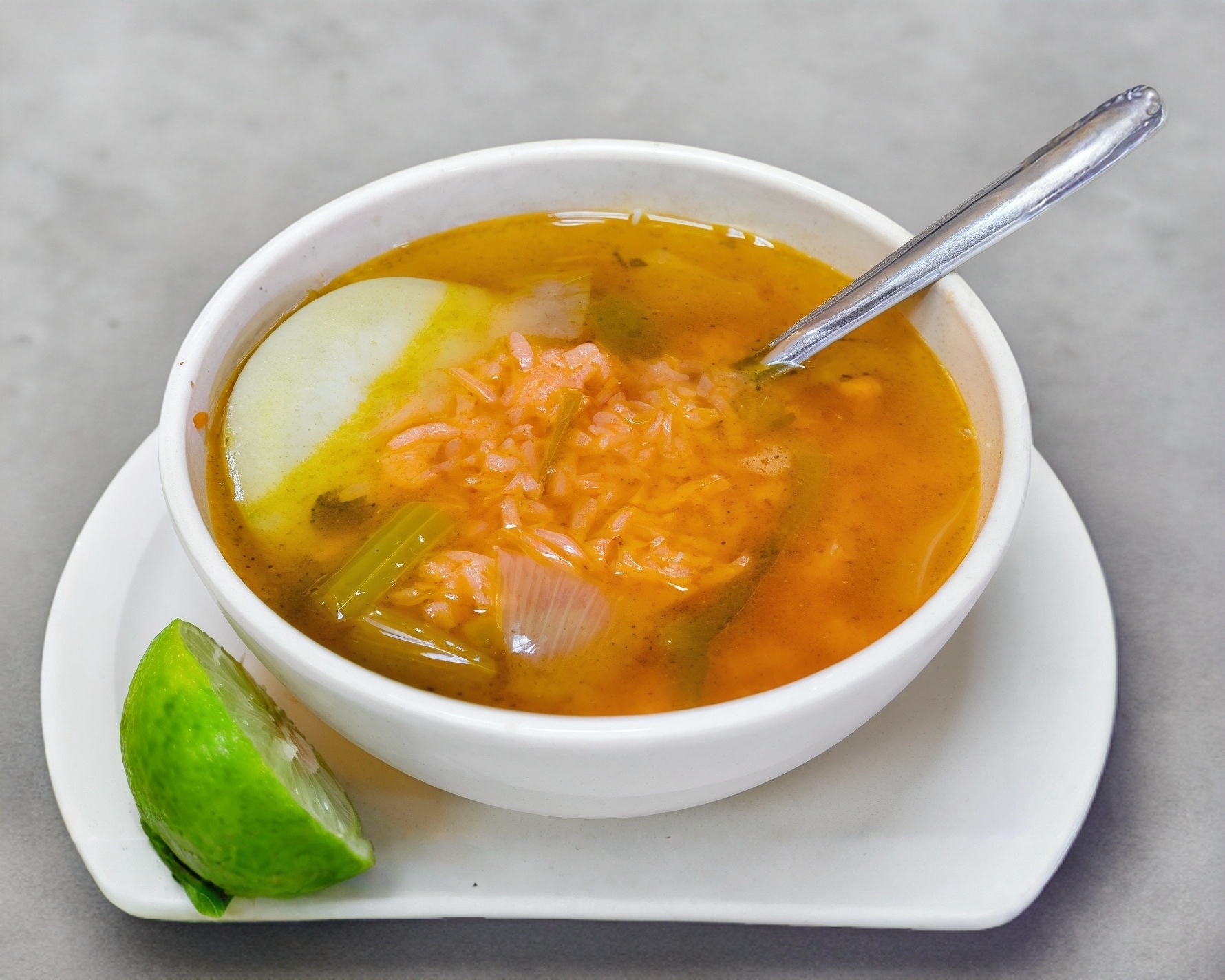 Caldo 100% de pechuga de gallina desmenuzado, con verdura, papa y arroz. Acompañado de tortillas, limon, chile jalapeño y sal.