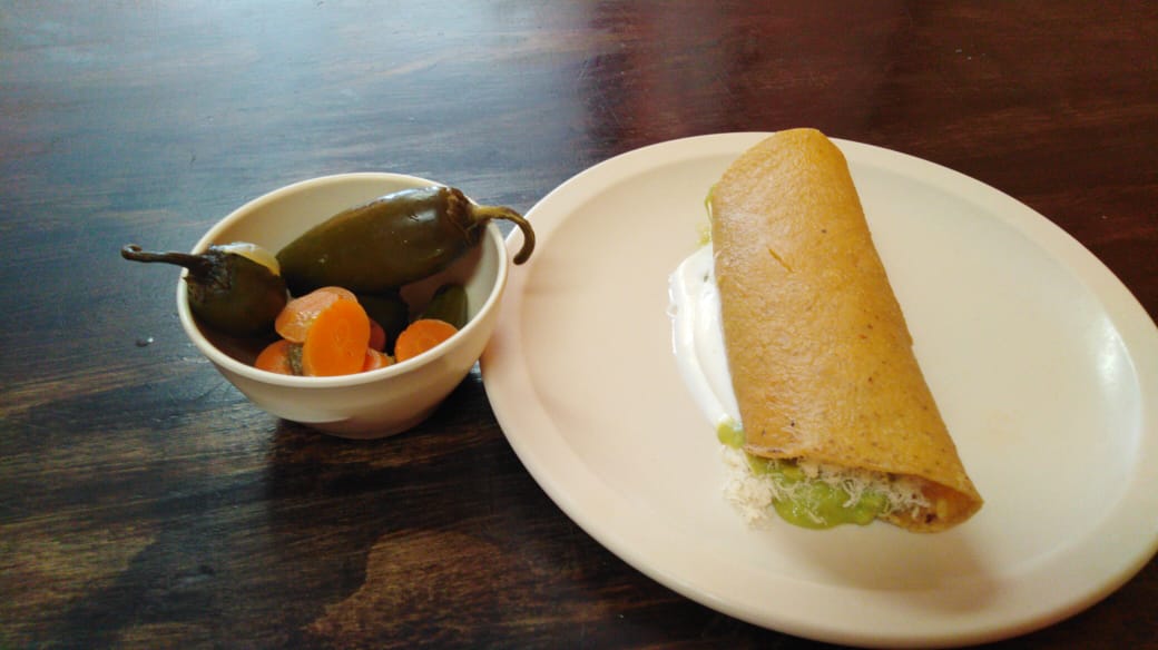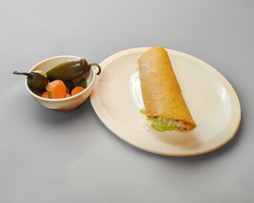 Taco grande con guacamole, pechuga de pollo desmenuzado y crema. Adicional con chiles en vinagre.