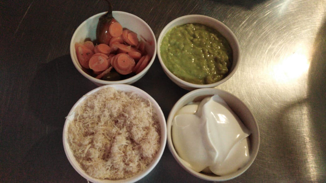 Tostada grande con guacamole, pechuga de pollo desmenuzado y crema. Adicional con chiles en vinagre.
