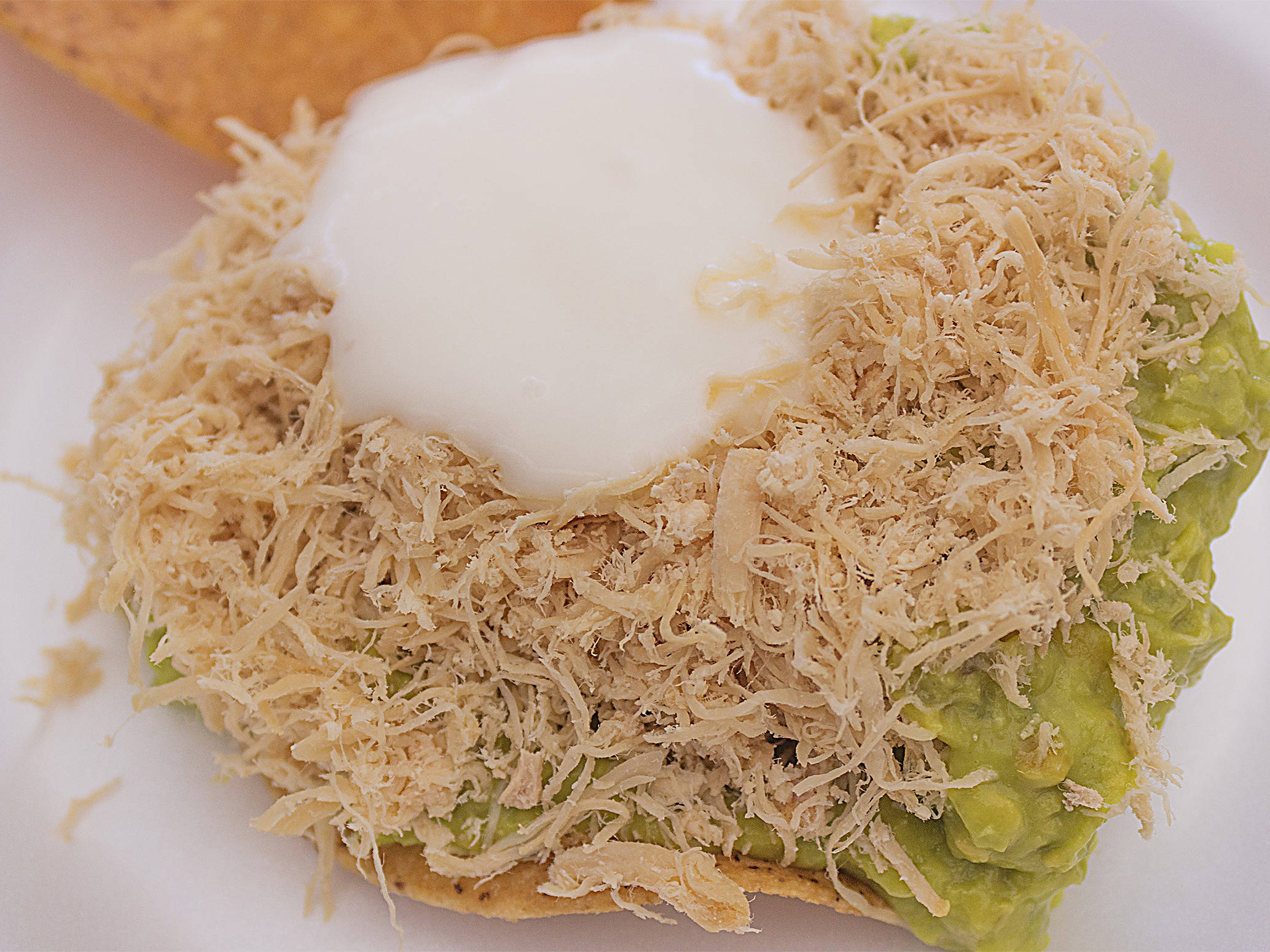 Envueltos dorados de pollo, guacamole, crema, ensalada y consome