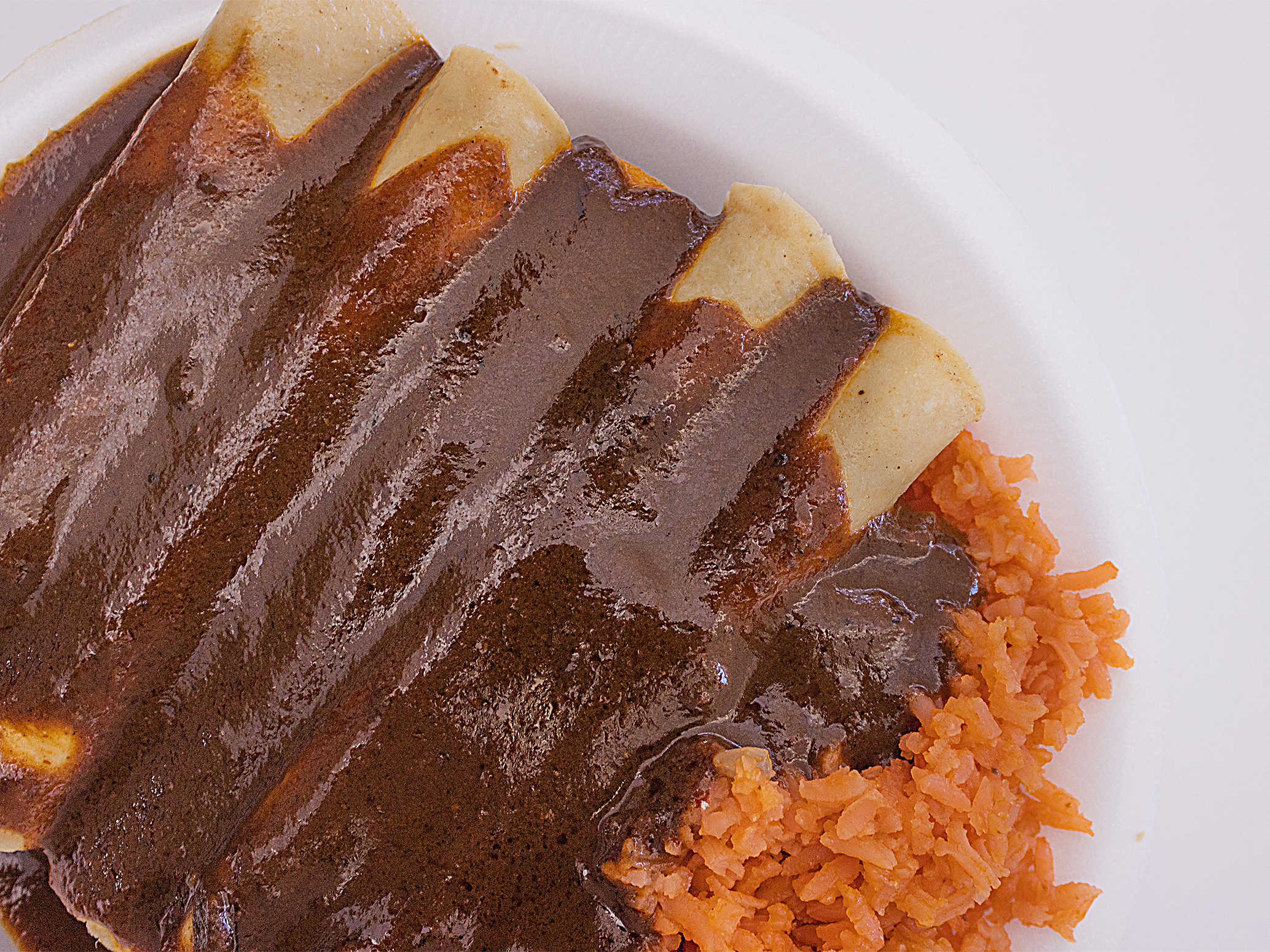Envueltos de pechuga, bañados en mole, arroz y consome