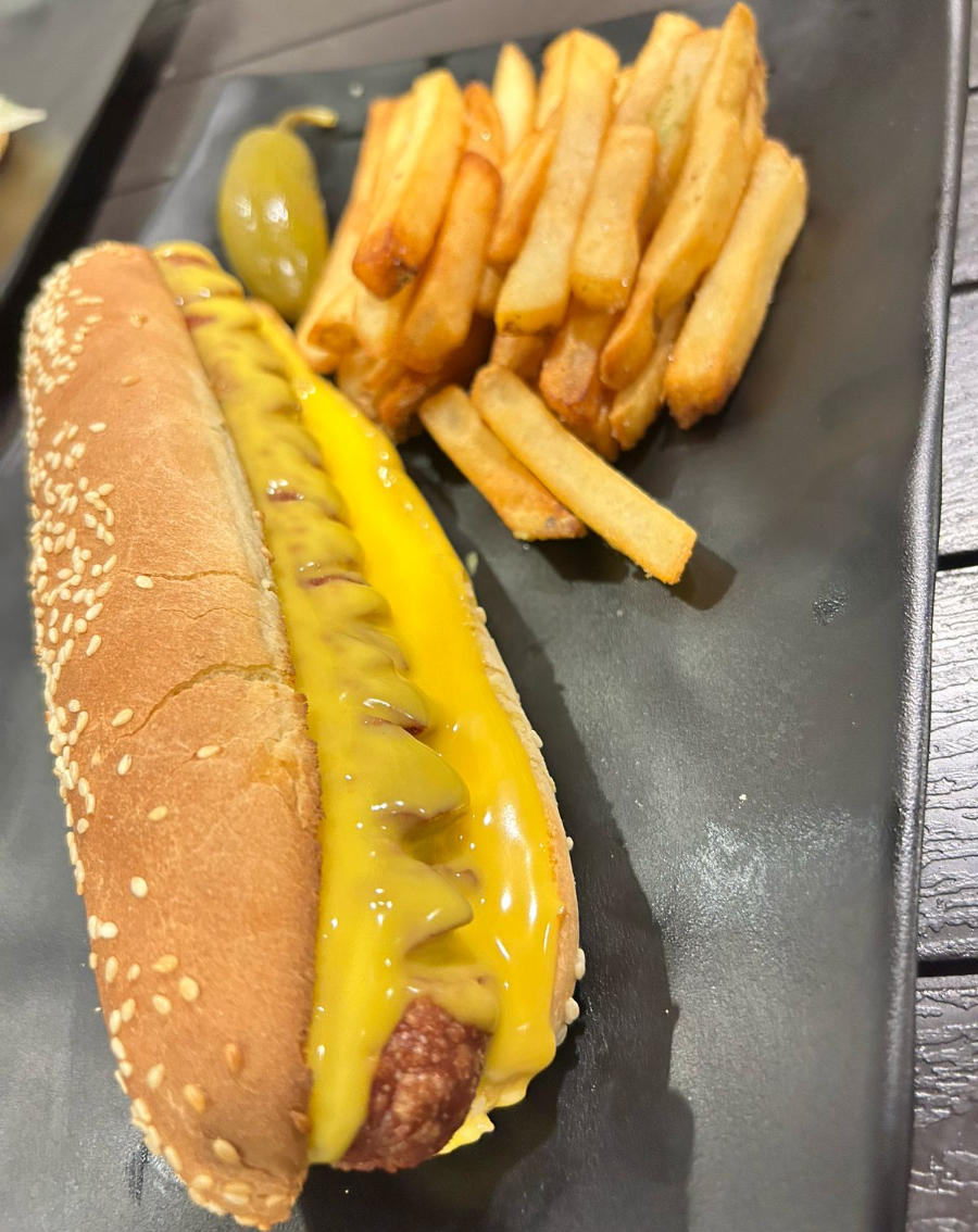 Un clásico que nunca falla. Salchicha jumbo de pavo o polaca con pan con ajonjolí, aderezo de la casa, queso de gallo y jalapeños, cebolla y tomate.